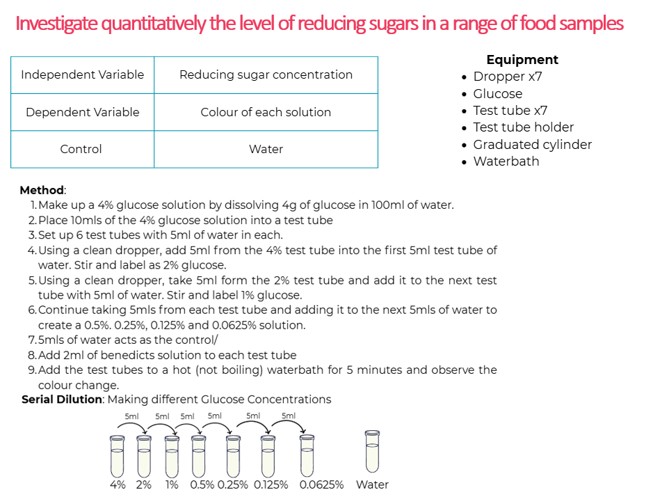 1.2.6. investigate quantitatively the level of reducing sugars in a range of food samples, use primary data to support conclusions